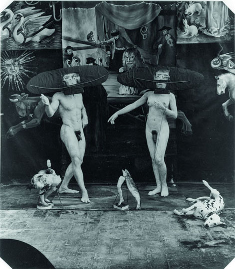 Witkin's photography, rich in its surreal and baroque influences, crosses established frontiers. It refers to religious episodes and classic paintings, but is also deeply marked by personal experiences. Against a dark and symbolic backdrop, full of busy people, the figures of animals and astrological references, two naked bodies, with dramatic poses and strongly gestural movements, flaunt their nakedness; one of the two is clearly a hermaphrodite. At his feet, a curled-up dog and a large fish resting on severed legs emphasize the sensation of finding ourselves in a theater of the absurd. Drawing elements from theater, the artist makes explicit his relationship with the representation. As spectators, we see ourselves catapulted into an artificial universe that nonetheless becomes extremely artistic if we are willing to perceive it as a materialization of the ghosts of the unconscious. All that the world considers beautiful is just one part of reality, full of contradictions and of internal struggles, in a continual return of the feelings of life and death. |