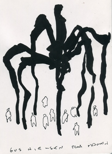 “Spider” ha tendido una red con forma de cilindro. Es una trampera a escala humana. Adentro está el sillón favorito de la escultora. Cuelgan de delgados hilos de baba su perfume de siempre, un camafeo con la foto de una señora, unos broches para el pelo, unos collares, tres jarras de vidrio, un reloj, huesitos limpios de caracú. Hay adherida a las paredes de la trampa restos de tapices deshilachados. La puerta está abierta. El reloj marca las doce, hora de comer.