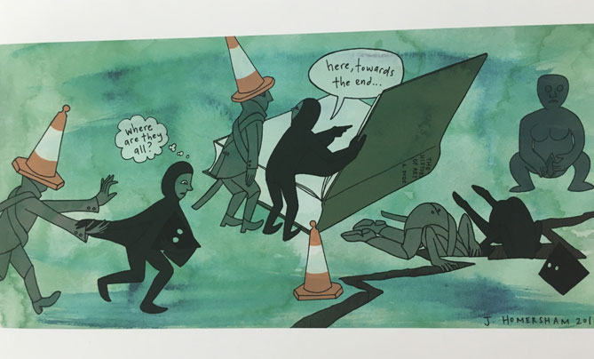 Cuando se trata de dibujar, Julia se deleita en el sinsentido, la subversión y el juego de palabras. Le divierte crear personajes a partir de objetos inanimados que son, a primera vista, bastante adorables, pero que contemplados más de cerca, revelan dramas oscuros casi mortales.