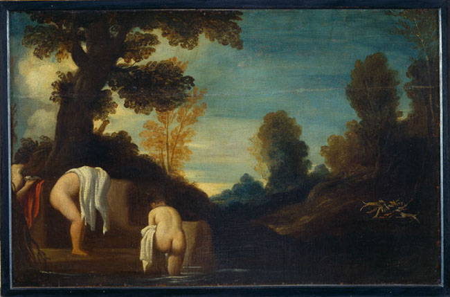 Se trata de una copia de la obra autógrafa conservada en el Museo Boymans van Beuningen de Rotterdam, hecha probablemente en el taller del propio Guercino. La pequeña tela muestra dos figuras - ¿Diana y una ninfa? - que están a punto de tomar un baño, con un encantador paisaje de fondo. La suavidad de las formas femeninas logran una correspondencia con las curvas de los elementos de la naturaleza; el dominio de la luz y del color están perfectamente calibrados. Es difícil sustraerse a la fascinación de una edad mitológica y arcádica en la cual el Cuerpo es partícipe, coprotagonista y guía de la belleza de la naturaleza. |