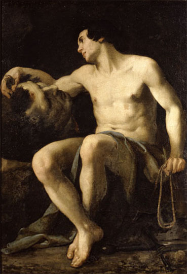 Con su naturalismo calmo y templado, que tiene el tono de un compuesto clasicismo, Spadarino nos propone una figura de David poco convencional. El jovencito bíblico asume aquí la apariencia de un héroe clásico, un Apolo pensativo y absorto. De su lucha con el gigante Goliat, el artista capta la dimensión más íntima y psicológica, aunque toda la atención del observador se concentra en la forma de los miembros. El joven cuerpo se inunda de luz, lo que exalta las formas armoniosas y fuertes, mientras el brazo se apoya en la horrenda cabeza cercenada del gigante, cuyo cabello casi parece acariciar en un último gesto de piedad. |