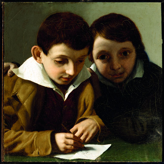 Esta pintura muestra las cualidades del pintor como retratista, y sus elecciones de purismo y de exhibición controlada y mesurada de los sentimientos. La obra ganó un concurso de coloración en 1835. Los dos muchachos muestran el lado sentimental de lo cotidiano, la poética de los afectos, el mundo de la infancia –en este caso, relacionada con el acto de dibujar, y en consecuencia, con un momento de diversión– y están presentados mediante una exhibición naturalista y no idealizada de los rostros. |