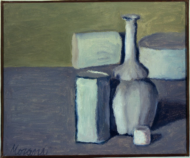Morandi, uno de los máximos exponentes de la pintura italiana del siglo XX, vuelve a proponer en esta obra su tema predilecto: la naturaleza muerta. El artista, en todas sus obras, utiliza solamente un sobrio repertorio de elementos –botellas, jarros, cacharros, lámparas y fruteras– que se transforman en objetos omnipresentes, aunque encarados de manera siempre diferente. A través de la reiteración del mismo objeto logra transformar la naturaleza muerta en un teatro de lo existente, expresando la dinámica de las relaciones cotidianas. Aunque los objetos que utiliza son familiares, están cargados de significados siempre novedosos. |
