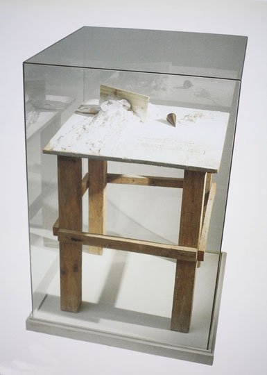 El trabajo humano es uno de los temas permanentes en el desarrollo de Víctor Grippo a través de un interés antropológico de rescate de hábitos ancestrales y de un lenguaje de retorno a lo simbólico. Desde 1966 señaló la centralidad cultural de la herramienta apuntando, entre otras razones, a una “coincidencia entre arte y trabajo”. En 1976 realizó la instalación Algunos Oficios, homenaje a los cinco oficios tradicionales de herrero, carpintero, albañil, picapedrero y horticultor. Esta relación entre arte y oficio se prolongó a lo largo de toda su trayectoria. Mesa de Albañil es un ejemplo de lo citado. Se trata de una mesa donde parece descansar momentáneamente la acción de un trabajador – yeso, cuchara de albañil, plomada-. La mesa, como el lugar de síntesis del trabajo y la vida humana, es otra de las constantes en su obra. En su tabla se halla escrita la siguiente frase: “Ellos cantan haciendo la casa de los otros” (Elogio de los albañiles italianos. Gustavo Riccio). La obra se completa con una cúpula de vidrio similar a las que pueden encontrarse en salas de exhibición o museos de ciencias naturales. |