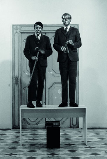 El trabajo de Gilbert & George se centra en la producción de una arte de fuerte impacto comunicativo, que supera las tradicionales barreras entre arte y vida y analiza en profundidad la condición humana. Los propios artistas, con sus vivencias, se someten en principio a ese minucioso examen, en una óptica que muestra la coincidencia entre artista y obra. “Ser esculturas vivientes es nuestra linfa, nuestro destino, nuestra aventura, nuestro desastre, nuestra vida y nuestra luz”, declaran ambos artistas. Gilbert & George hacen de todo para que no exista ninguna diferencia entre el arte y lo que constituye sus vidas. Marionetas satíricas en el límite entre lo humano y lo inhumano, perfectamente puestas a punto en sus elegancia falsamente casual con vestidos fin de siècle, pasan su jornada humana en la alegría de la vida. |