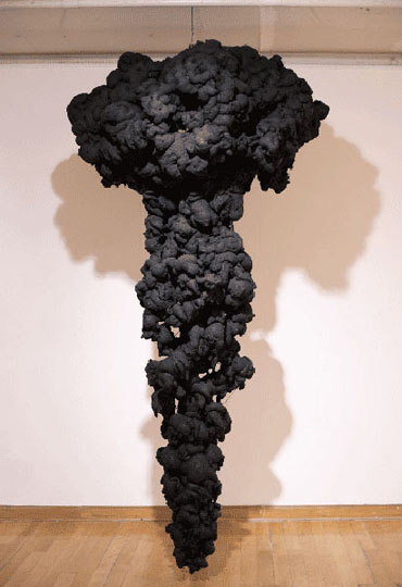 León Ferrari retomó en estos últimos años el tema de las bombas, armas de guerra y nucleares, que ya había integrado en los ‘80. En esos años utilizaba el collage en sus obras yuxtaponiendo fotos y fotomontajes a figuras de ángeles de iconografía tradicional cristiana. En la actualidad, trabaja estos temas pero utilizando el poliuretano como material para sus obras. Hongo nuclear, 2007 es un objeto/escultura de color negro, cuyo simbolismo refiere a la catástrofe y sus consecuencias nefastas, citando la famosa imagen del hongo producido por la explosión nuclear. La imagen, de una vigencia contemporánea y amenazadora, da cuenta de como ciertos países del mundo asientan su poder. |