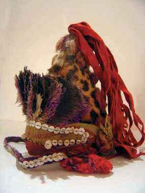 Gorro con piel de jaguar y cintas rojas de la cultura toba. Colección Museo Etnográfico UBA