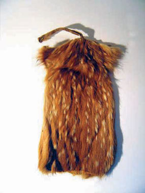 Tabaquera de piel de biguá, bordada en lana, de la cultura Toba, Chaco Colección Museo Etnográfico UBA