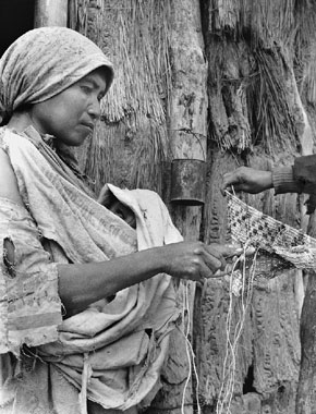 Mujer wichi teje un bolso con hilo de chaguar teñido con jugo de algarroba, según anotación de Grete Colonia 20, cerca de las Lomitas, Formosa, 18 de agosto de 1964 Colección Matteo Goretti