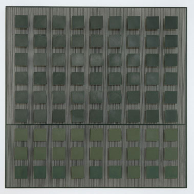 “Cuadrados verdes y negros”, 1974 Pintura y metal sobre madera Col. particular, Ciudad de México Fotografía: Jesús Sánchez Uribe