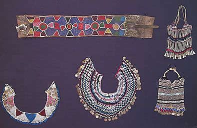 ChaquirasLas antiguas y valoradas llancas (cuentas de piedra) mencionadas por los cronistas, fueron progresivamente desplazadas por las "chaquiras", cuentas de vidrio de colores, introducidas por los blancos en el comercio con los indígenas. Abundan los testimonios sobre sartas de chaquiras que las mujeres enrollaban a sus trenzas, sus muñecas o sus tobillos, así como las referencias a los anchos cinturones, cubiertos de cuentas. Ya en 1806, Luis de la Cruz, registra estos cintos entre los pehuenches con el nombre de "quepigue" En ellos, los extremos de los tendones que enhebran las sartas de cuentas de distintos largos, se fijan a la base de cuero siguiendo los requerimientos del diseño.También se confeccionaron piezas con enhebrados más complejos que los de las simples sartas, en los que los hilos realizaban trayectos múltiples, lo que permitía obtener verdaderas mallas. Según el tipo de enhebrado, estas mallas eran más compactas, como en los tapawe, o más abiertas y de celdas romboidales como las de los meñake -collares anchos y planos que rodeaban la base del cuello- y las de los llankatu pechu -pectorales de chaquiras, enriquecidos a veces con el agregado de monedas, tubos y campanitas- que se pueden observar en esta vitrina. Con el brillo y las tonalidades del vidrio que las chaquiras pusieron a disposición de las mujeres, éstas supieron crear un arte personalísimo que adornaba partes de su cuerpo con bellos acentos de color. "(...) pero las mujeres de los caciques o las mujeres ricas, demuestran su lujo llevando ese cinturón de cuero, sobre el cual con hilos de rendones [tendones] fijan dibujos de perlas de colores de lo más regulares, parecidos siempre, más o menos, a grecas por las líneas rectas que los componen; ese adorno es el más apreciado por las mujeres". (En 1829 d'Orbigny visitó Carmen de Patagones y recorrió parte del Río Negro) Alcide d'Orbigny, Voyage dans l'Amérique Méridionale. París, 1835-1847 "La menor acción que hacen produce una sonaja, y como la tienen por una cosa magnífica, se mueven mucho más de lo que es preciso". (Federico Barbará integró el Ejército del Sur en las campañas contra las ofensivas indígenas de 1855 y 1856) Federico Barbará, Usos y costumbres de los indios pampas, 1856. |