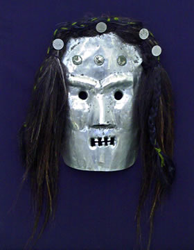 Installations views Hijos del viento I Hijos del viento II Hijos del viento III Hijos del viento IV Hijos del viento V Works Conjunto de toki Trarilonko Nitrowe Tupu Akucha Chaquiras Meñake Llankatu pechu Gargantilla Lloi-lloi Prendedor de tres cadenas Kollonh Trapelakucha KollonhEl uso de la máscara -kol'ong o kollonh- supone siempre un cambio de identidad ("kolon: el disfrazado") Las máscaras mapuches suelen ser de madera y presentan crin en la zona que corresponde a los cabellos, a las cejas etc.Por lo tanto la pieza exhibida es muy peculiar por ser una máscara de metal -plata- y por su extremada síntesis. Los dos orificios de los extremos laterales confirman que ésta era ajustada a la cabeza del individuo que la portaba. "Allí me encontraba con el cacique [en los toldos de Ñancucheuque], explicándole la composición de un paraguas antiquísimo y desvencijado, recuerdo quizás de alguna invasión lejana que era guardado como una de sus prendas más importantes, junto con una gran máscara de madera (objeto muy interesante bajo el punto de vista etnográfico y que no pude obtener ni copiar). Ambos salían a lucir, en los grandes festejos, llevados por un indio que envuelto en un quillango hacía contorsiones carnavalescas, cancaneando y asustando a las mujeres y los chiquillos de la tribu". (Relato de Francisco P. Moreno referido a su visita a los toldos de Ñancucheuque en el País de las manzanas en diciembre de 1876) Francisco P. Moreno, Viaje a la Patagonia Austral 1876-1877. Bs.As., 1879. |