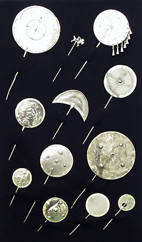 Installations views Hijos del viento I Hijos del viento II Hijos del viento III Hijos del viento IV Hijos del viento V Works Conjunto de toki Trarilonko Nitrowe Tupu Akucha Chaquiras Meñake Llankatu pechu Gargantilla Lloi-lloi Prendedor de tres cadenas Kollonh Trapelakucha TupuLa voz tupu, que denomina a estos pinches de cabeza discoidal, es de origen quechua y probablemente la misma pieza es una incorporación araucana de una joya andina. Los tupu se confeccionaban a partir de una lámina de plata martillada. Suelen presentar una ornamentación sobria, reducida a juegos de líneas de puntos repujados que dibujan cruces, círculos y flores, o líneas cinceladas que excepcionalmente remiten a roleos vegetales. A veces, una o dos monedas sirven para fijar en el frente los remaches que sujetan el alfiler en el revés del disco. |