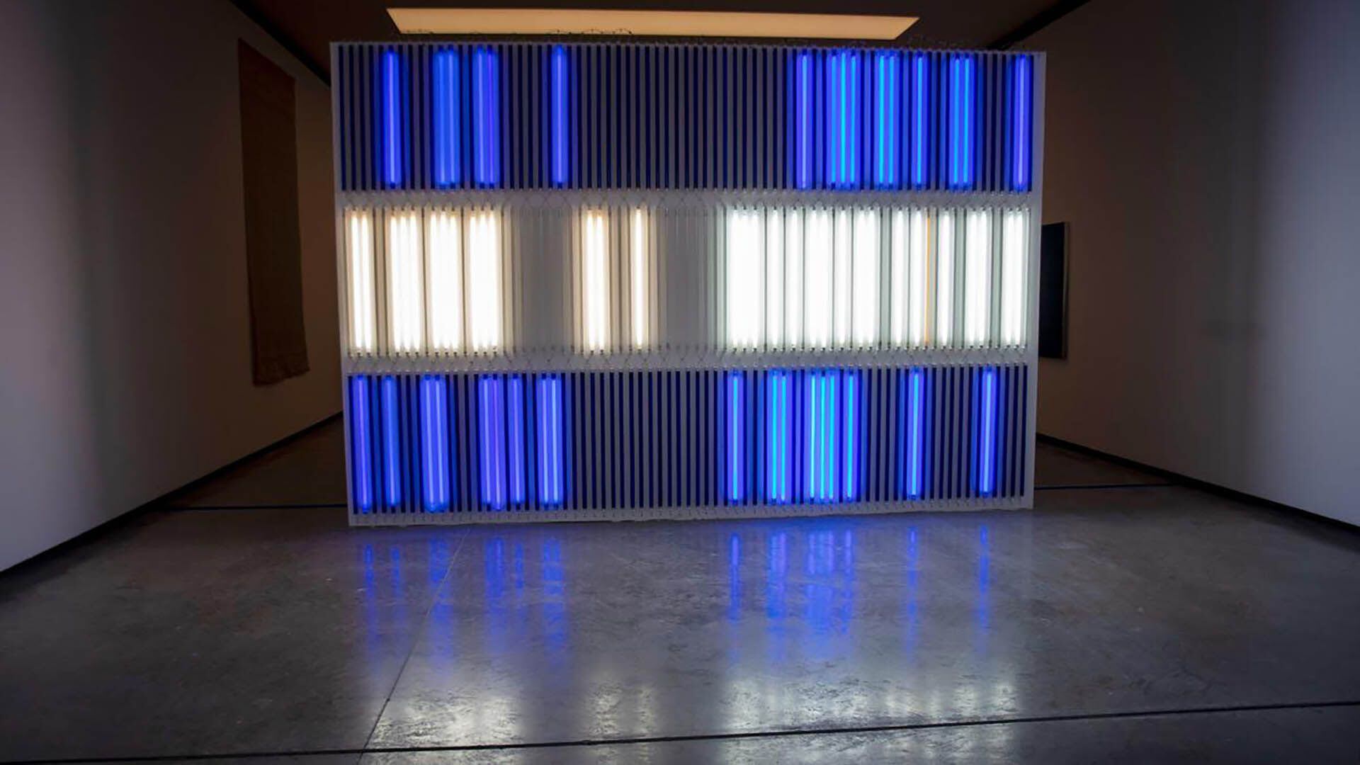 Sergio Avello compuso su obra “Bandera” con tubos de luz que se encienden y se apagan. ¿Metáfora del país? "Conjeturas", en Fundación Proa. Fotos: Proa