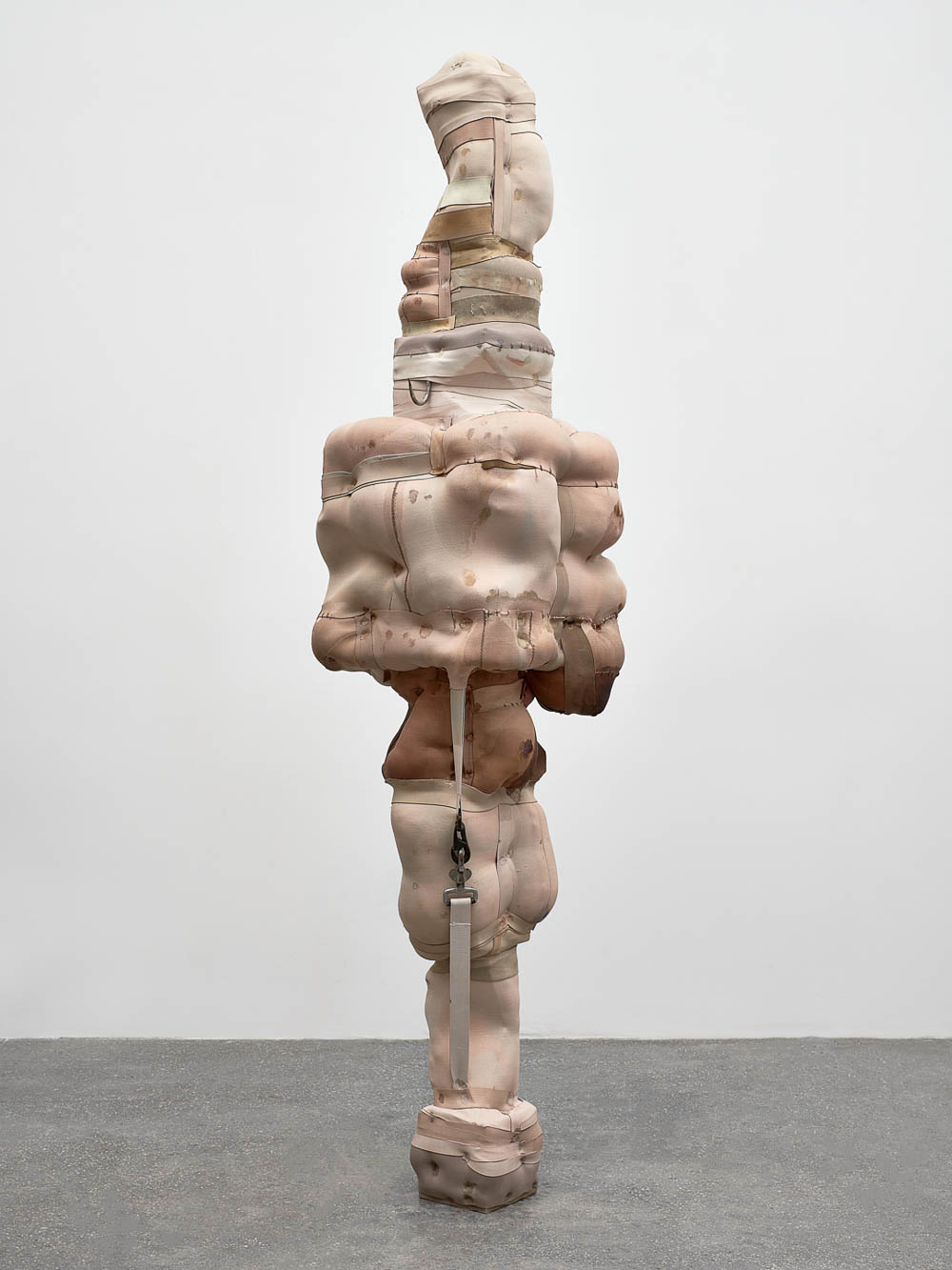 In Patricia Ayres’s work, structures of social conditioning—particularly Catholic morality, incarceration systems, and stereotypes surrounding the body—function as central conceptual cores. Influenced by her background in fashion, Ayres creates sculptures wrapped in meters of elastic that give rise to imposing yet fragile corporeal forms, traversed by the symbolic resonances of their materials. In this sense, the artist reflects: “Elastic is used in fashion, but also in medical and military contexts; its use evokes ideas of wounding, repair, and control.” Many of her pieces appear “tied” with harnesses, pierced with butcher hooks, and assembled with parachute hardware, then dyed with anointing oil, sacramental wine, iodine, ink, and what the artist describes as gunk.
