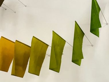 In the installation created specifically for this exhibition—an aligned row of roughly thirty flags made from hand-painted paper towels—Odriozola pushes this method to its limit. Each flag is an operation requiring meticulous manual work, yet taken together they form a device that oscillates between the fragile and the constructive. His work reveals how the minimal, when repeated and reorganized, can produce an image that challenges our assumptions about the value of materials.