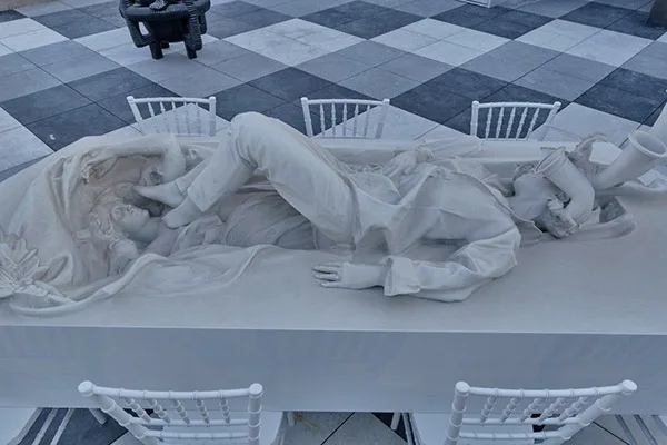 Esa parte del cuerpo del animal es sostenida por un joven cuya mirada está enmarcada, a su vez, por un par de manos suspendidas en el aire. Apenas una de varias situaciones surrealistas creadas por este artista rosarino que llegó a exhibir en la Bienal de Venecia y en la Documenta de Kassel, y que conforman lo que el curador Francisco Lemus define como “un banquete escultórico”. “Mesas sobre un piso ajedrezado, figuras humanas detenidas en gestos ambiguos, objetos híbridos, vegetación y mobiliario evocan un ritual suspendido -señala-. Esta escena desarma la linealidad de la historia del arte y propone un relato fracturado donde lo antiguo y lo contemporáneo conviven en un mismo plano”.