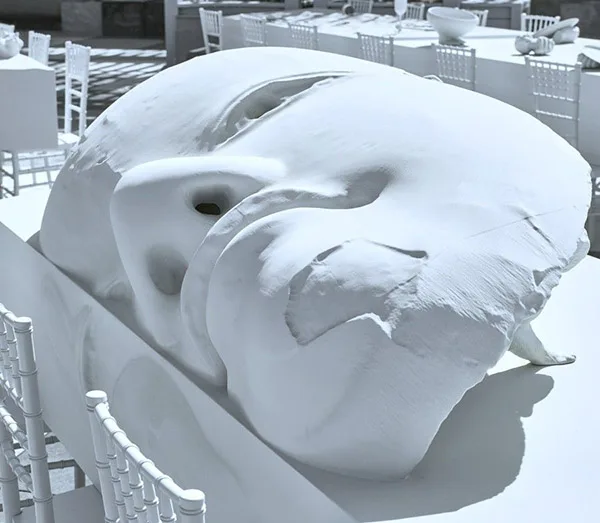 Esta inmensa instalación semejaba un banquete con mesas dispuestas, figuras congeladas en gestos ambiguos. Villar Rojas trabajó con distintos departamentos del Museo que incluían patrimonio, arqueología, artes decorativas, más de cien piezas, réplicas del acervo. “El teatro de la desaparición” no significa destrucción sino transformación ya que reaparecen en un universo en el que se inscribe el tiempo y la memoria . Esta obra aún continúa conmoviéndonos.