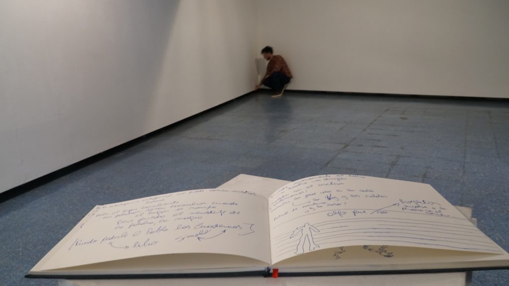 Pereyra desarrolla su obra en tiempo real en la sala de planta baja. A partir de un gesto recurrente, el artista escribe sobre las paredes expandiendo el trazo de su lápiz azul hasta convertir el espacio en una página en blanco.