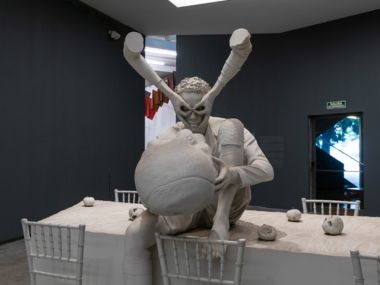 La instalación adopta la forma de un banquete escultórico: mesas dispuestas sobre un piso ajedrezado, figuras humanas dormidas o detenidas en gestos ambiguos, objetos híbridos, vegetación y mobiliario que remiten a un ritual suspendido. La escena desarma la linealidad de la historia del arte y propone un relato fragmentado en el que lo antiguo y lo contemporáneo conviven en un mismo plano. En este sentido, la noción de “desaparición” no implica destrucción, sino transformación: los objetos se desprenden de su función original y reaparecen en un universo alterado en el que tiempo y memoria se reescriben.